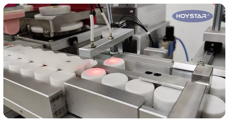 Ang makina ay na-configure na may isang sistema ng paggamot sa apoy upang mapahusay ang pagdirikit ng tinta sa ibabaw ng takip ng bote, pagpapabuti ng tibay ng pag-print.